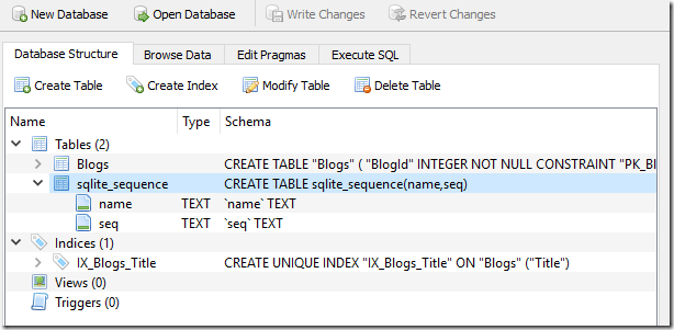 public class MyDbContext : DbContext { public DbSet<Blog> Blogs { get; set; } protected override void OnConfiguring(DbContextOptionsBuilder optionsBuilder) { optionsBuilder.UseSqlite("Filename=TestDatabase.db", options => { options.MigrationsAssembly(Assembly.GetExecutingAssembly().FullName); }); base.OnConfiguring(optionsBuilder); } protected override void OnModelCreating(ModelBuilder modelBuilder) { // Map table names modelBuilder.Entity<Blog>().ToTable("Blogs", "test"); modelBuilder.Entity<Blog>(entity => { entity.HasKey(e => e.BlogId); entity.HasIndex(e => e.Title).IsUnique(); entity.Property(e => e.DateTimeAdd).HasDefaultValueSql("CURRENT_TIMESTAMP"); }); base.OnModelCreating(modelBuilder); } }