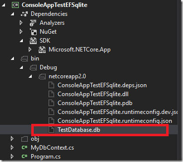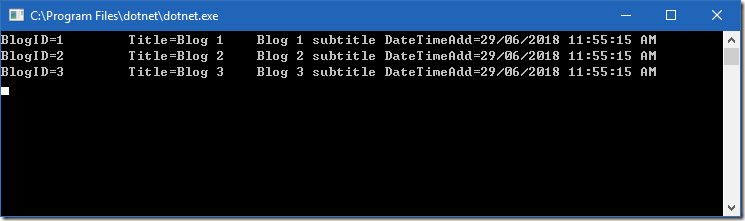 class Program { static void Main(string[] args) { string dbName = "TestDatabase.db"; if (File.Exists(dbName)) { File.Delete(dbName); } using (var dbContext = new MyDbContext()) { //Ensure database is created dbContext.Database.EnsureCreated(); if (!dbContext.Blogs.Any()) { dbContext.Blogs.AddRange(new Blog[] { new Blog{ BlogId=1, Title="Blog 1", SubTitle="Blog 1 subtitle" }, new Blog{ BlogId=2, Title="Blog 2", SubTitle="Blog 2 subtitle" }, new Blog{ BlogId=3, Title="Blog 3", SubTitle="Blog 3 subtitle" } }); dbContext.SaveChanges(); } foreach (var blog in dbContext.Blogs) { Console.WriteLine($"BlogID={blog.BlogId}\tTitle={blog.Title}\t{blog.SubTitle}\tDateTimeAdd={blog.DateTimeAdd}"); } } Console.ReadLine(); } }