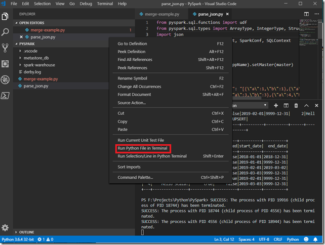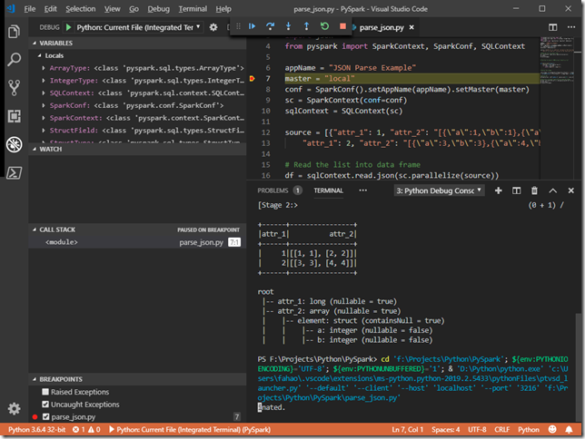 The page summarizes the steps required to run and debug PySpark (Spark for Python) in Visual Studio Code.