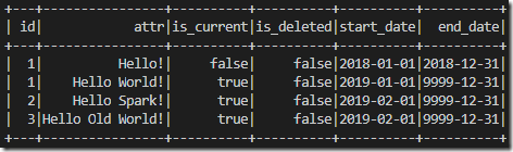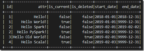 # Target data setdata_target = [Row(1, "Hello!", False, False, datetime.strptime('2018-01-01', '%Y-%m-%d'), datetime.strptime('2018-12-31', '%Y-%m-%d')),Row(1, "Hello World!", True, False, datetime.strptime('2019-01-01', '%Y-%m-%d'), datetime.strptime('9999-12-31', '%Y-%m-%d')),Row(2, "Hello Spark!", True, False, datetime.strptime('2019-02-01', '%Y-%m-%d'), datetime.strptime('9999-12-31', '%Y-%m-%d')),Row(3, "Hello Old World!", True, False, datetime.strptime('2019-02-01', '%Y-%m-%d'), datetime.strptime('9999-12-31', '%Y-%m-%d'))]schema_target = StructType([StructField("id", IntegerType(), True),StructField("attr", StringType(), True),StructField("is_current", BooleanType(), True),StructField("is_deleted", BooleanType(), True),StructField("start_date", DateType(), True),StructField("end_date", DateType(), True)])df_target = sqlContext.createDataFrame(sc.parallelize(data_target),schema_target)df_target.show()df_target.printSchema()