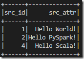 # Source data setdata_source = [Row(1, "Hello World!"),Row(2, "Hello PySpark!"),Row(4, "Hello Scala!")]schema_source = StructType([StructField("src_id", IntegerType(), True),StructField("src_attr", StringType(), True)])df_source = sqlContext.createDataFrame(sc.parallelize(data_source),schema_source)df_source.show()df_source.printSchema()